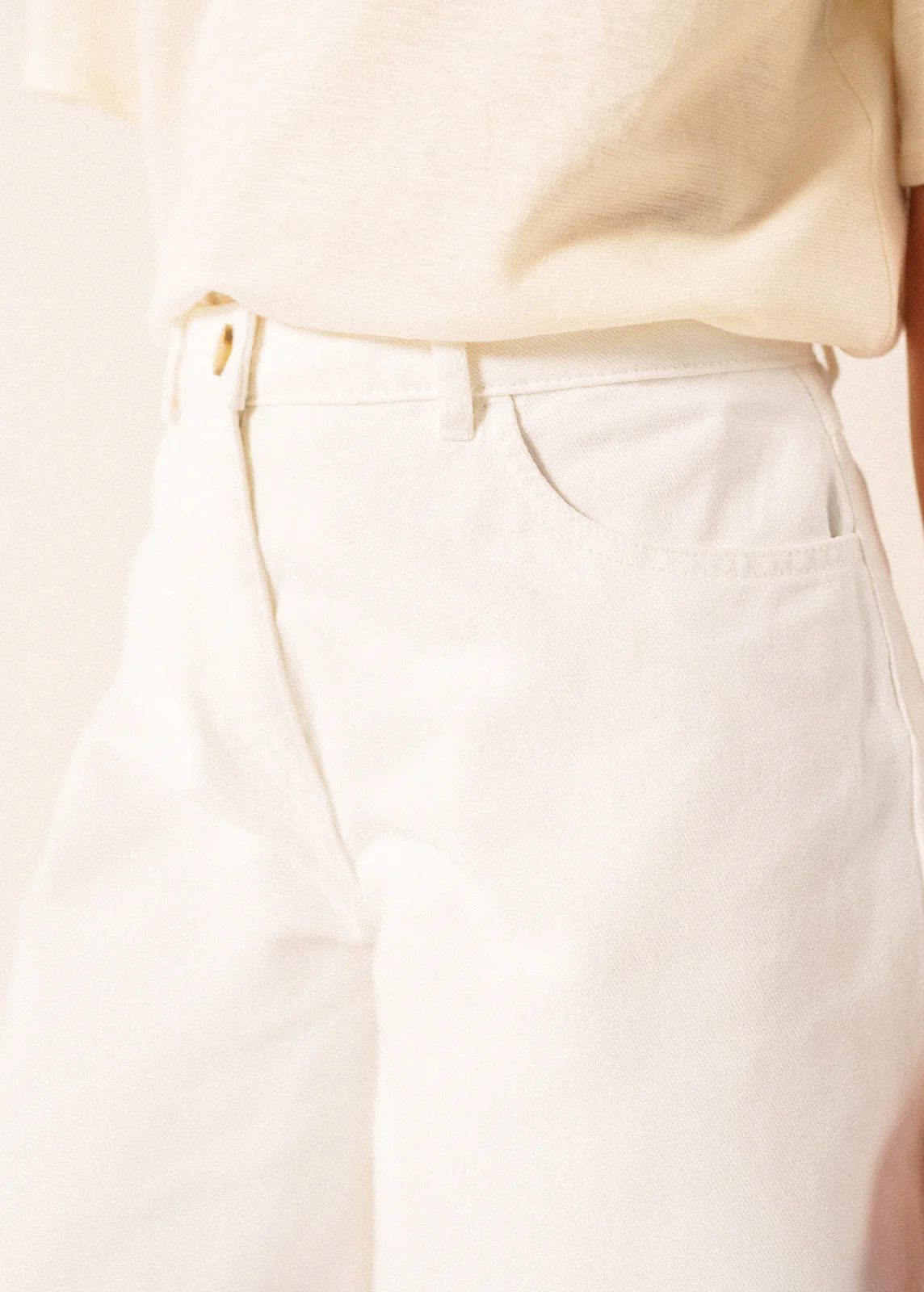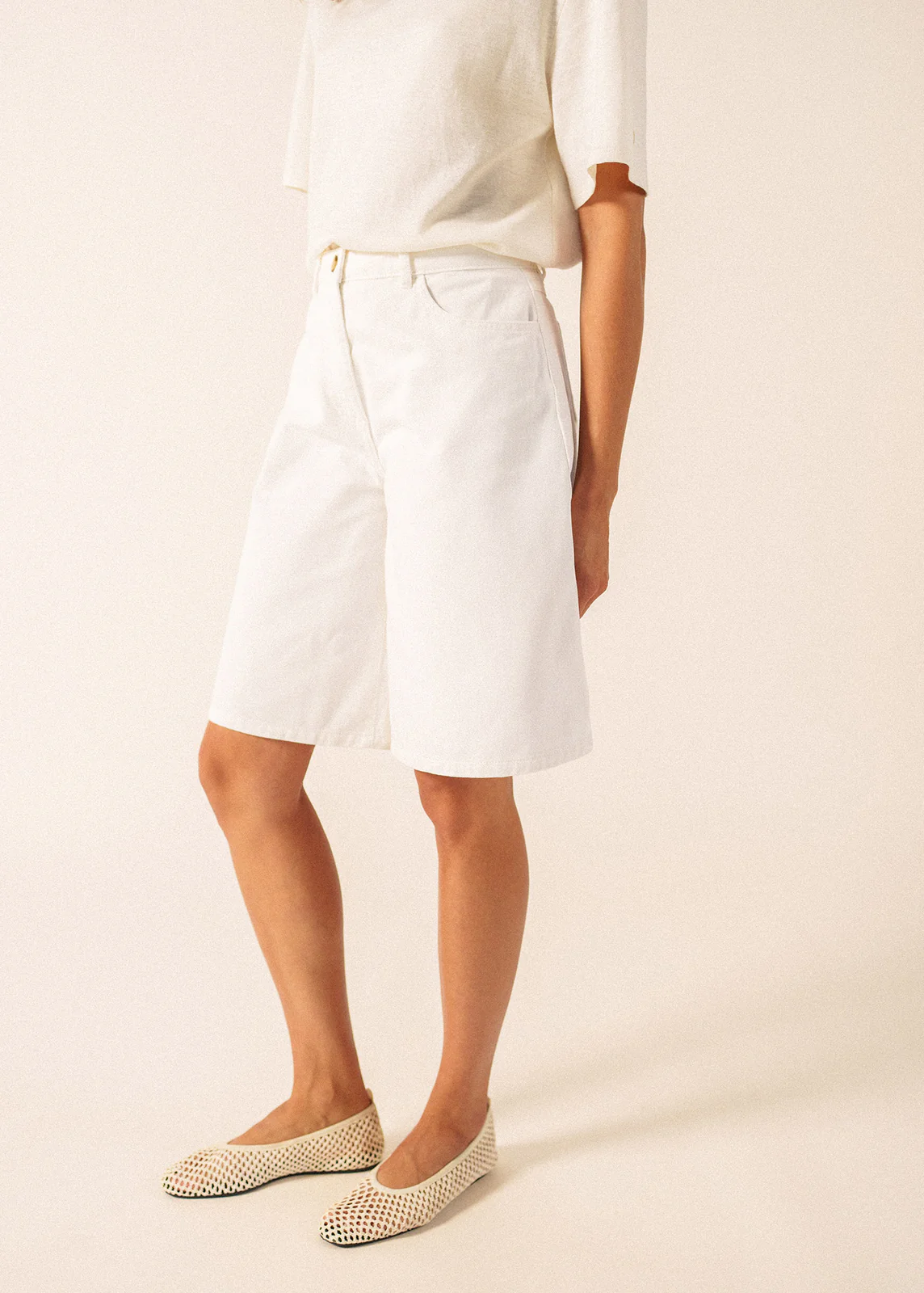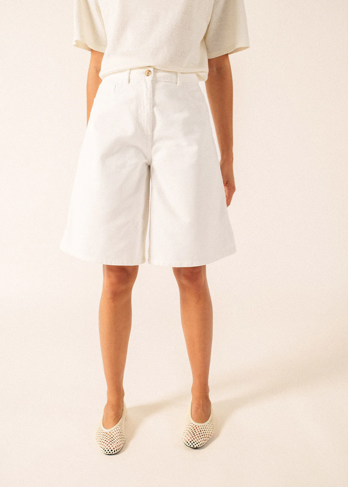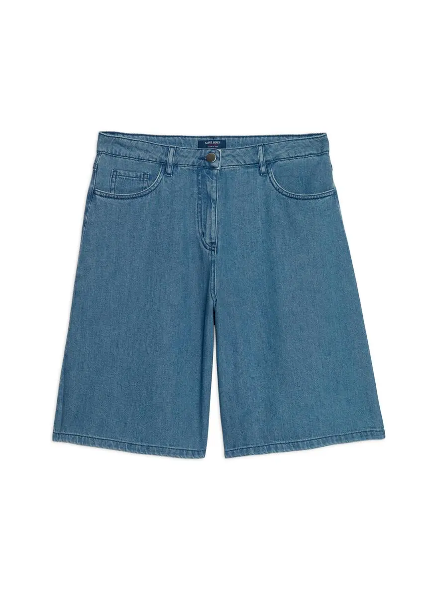 Sportlich-elegante Bermuda Shorts im «Culotte-Stil» 5-Pocket, knielang, mit ausgestelltem Bein, aus relativ leichtem Jeansstoff.