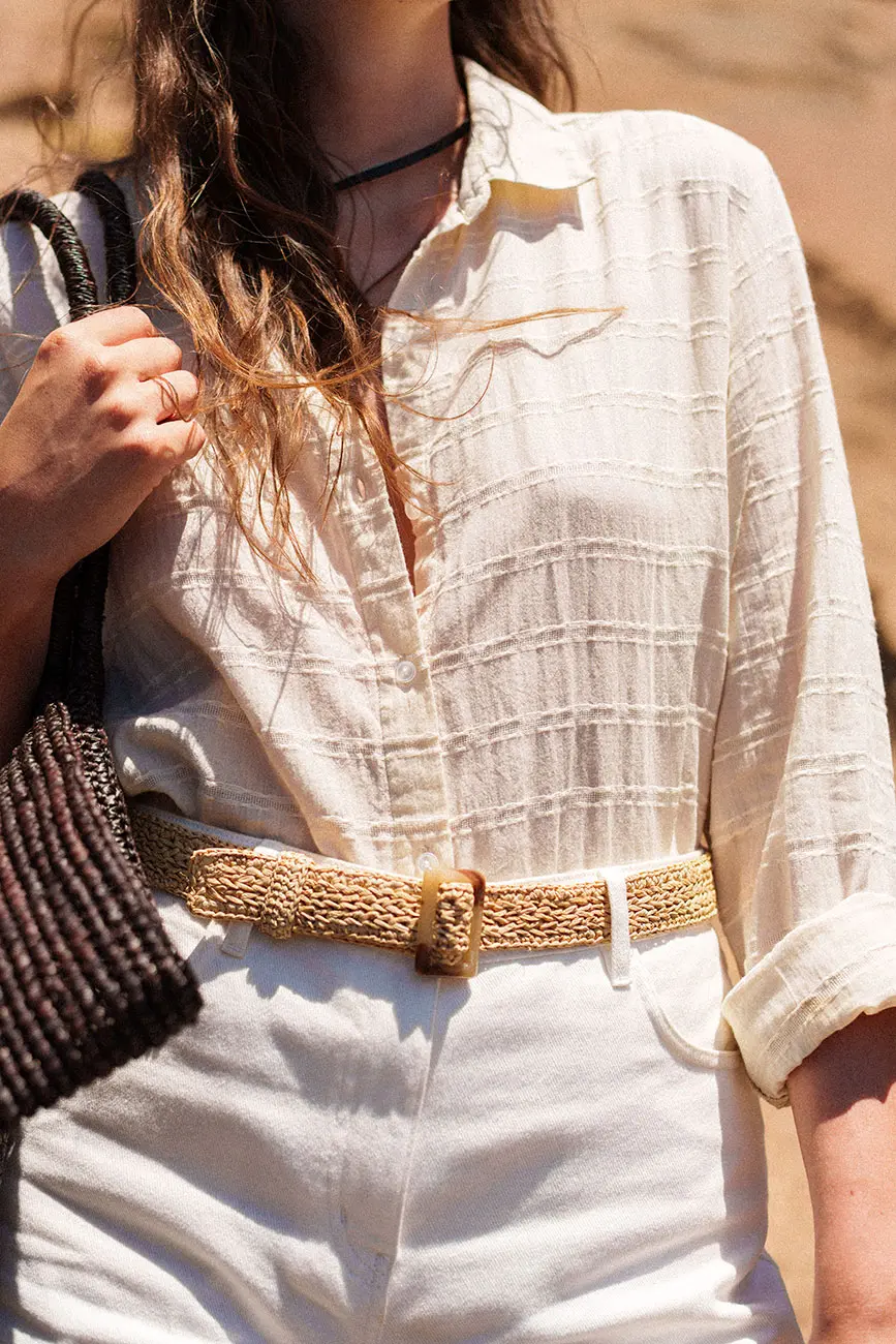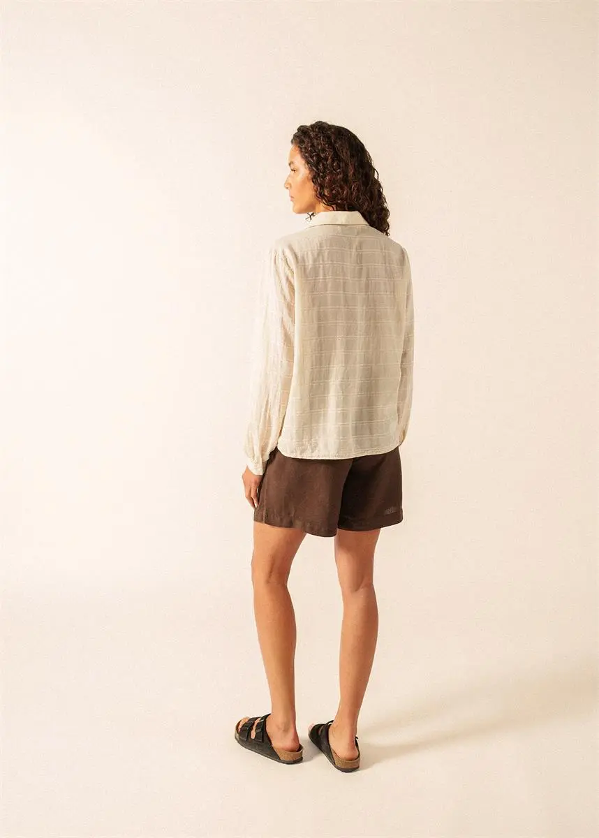 Sommerliche, langärmelige Damenbluse aus Jacquard-Baumwollvoile mit direkt in den Stoff eingewebter strukturierter Musterung. Dieses feine, atmungsaktive Material ist an heissen Tagen angenehm und leicht zu tragen. Die geknöpfte Bluse ist gerade geschnitten mit leicht ausgestellten Ärmeln, die der Silhouette ein dezentes Volumen verleihen.
