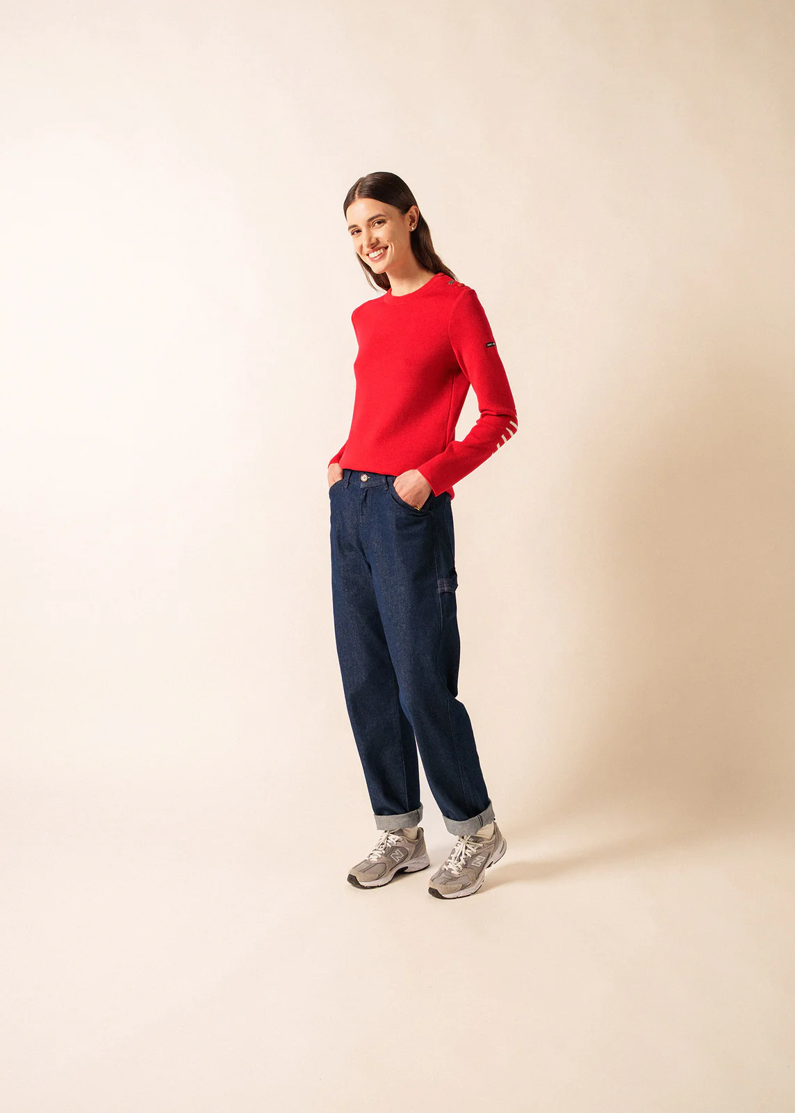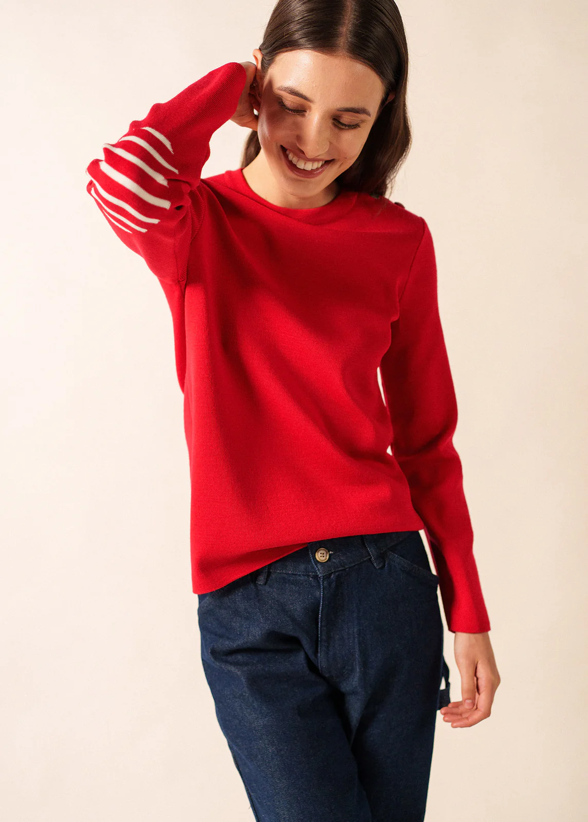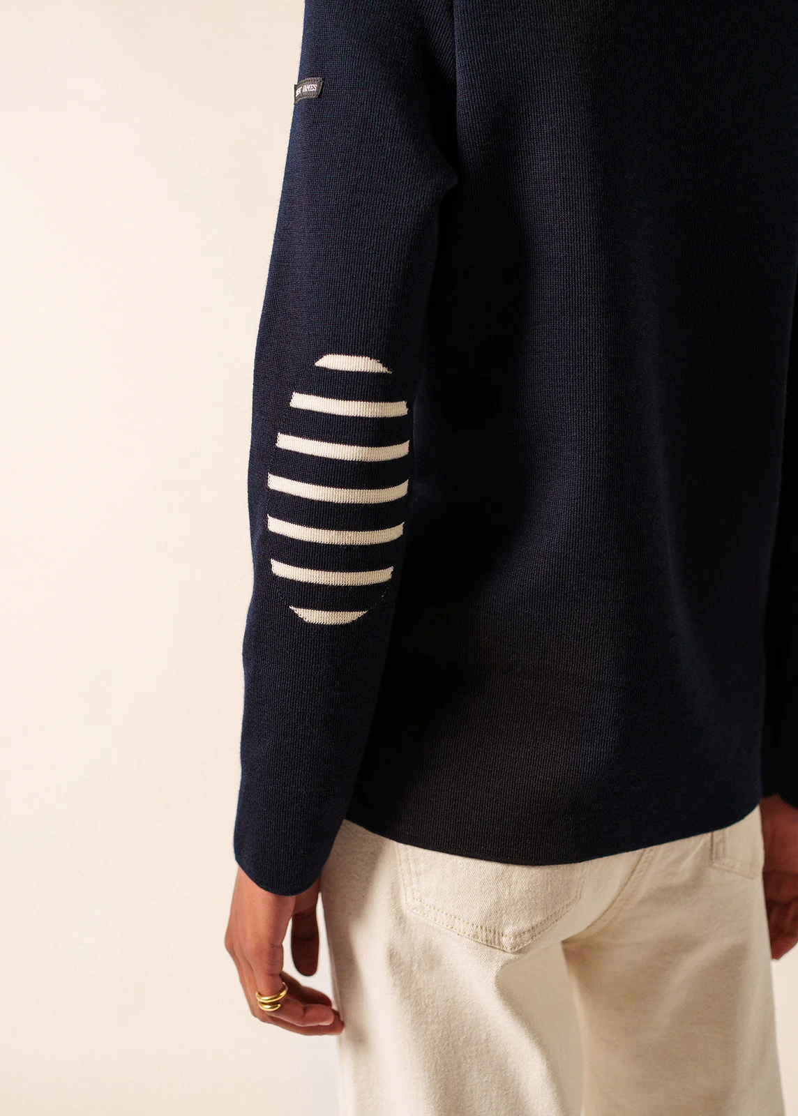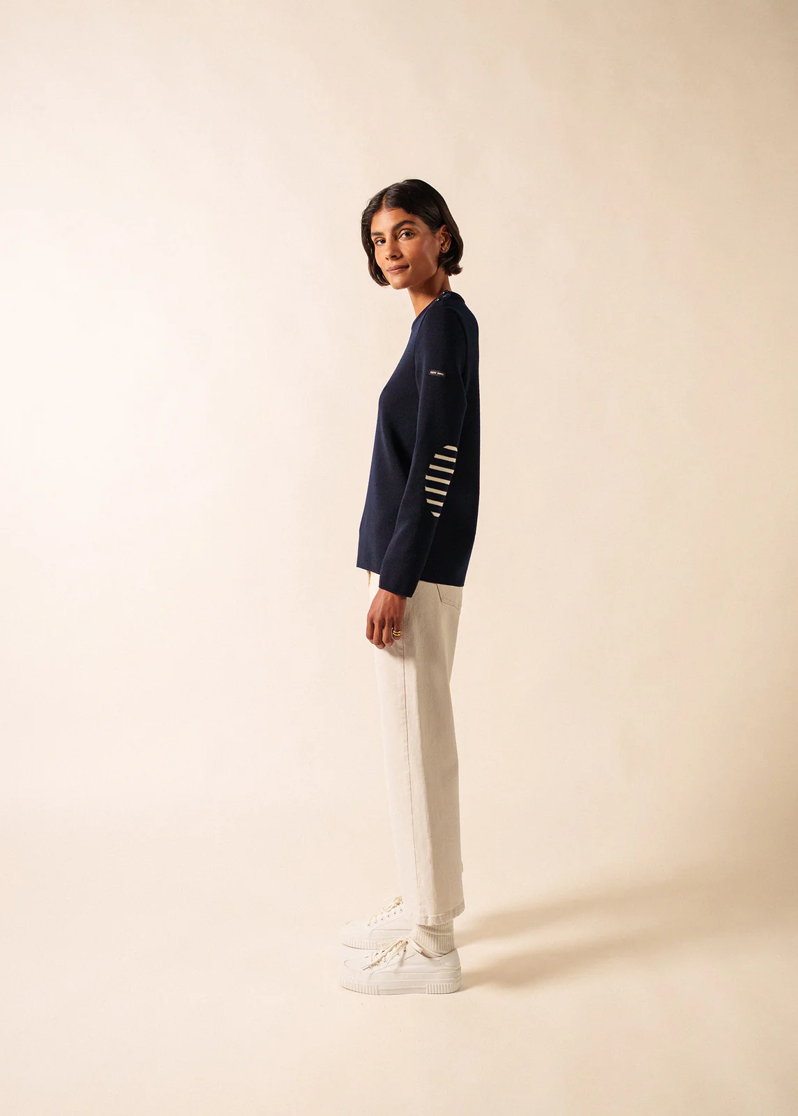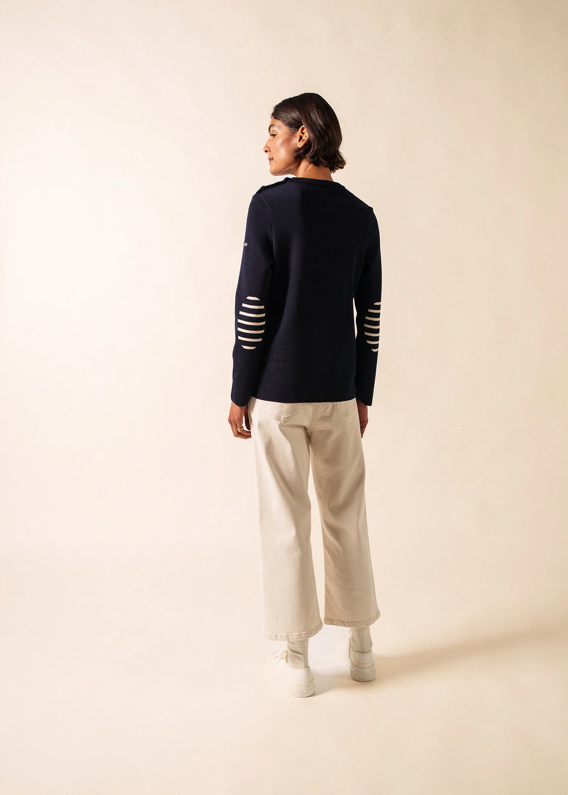 Marinepullover für Damen aus hochwertiger, feiner Merinowolle, angenehm wärmend, mit rundem Ausschnitt. Der gerade, etwas lose geschnittene Pullover wird auf einer Schulter geknöpft und ist mit verschiedenen, thematisch passenden Knöpfen bestückt. Gestreift gestrickte Einsätze an den Ellbogen vervollständigen den einzigartigen Look dieses Pullovers.